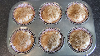 Spoon the batter into the muffin cups and set to one side while you prepare the sugar-cinnamon topping. Mix together 2-3 tablespoons of soft brown sugar and 1/2 teaspoon of ground cinnamon. Sprinkle the sugar-cinnamon over the top of each muffin.